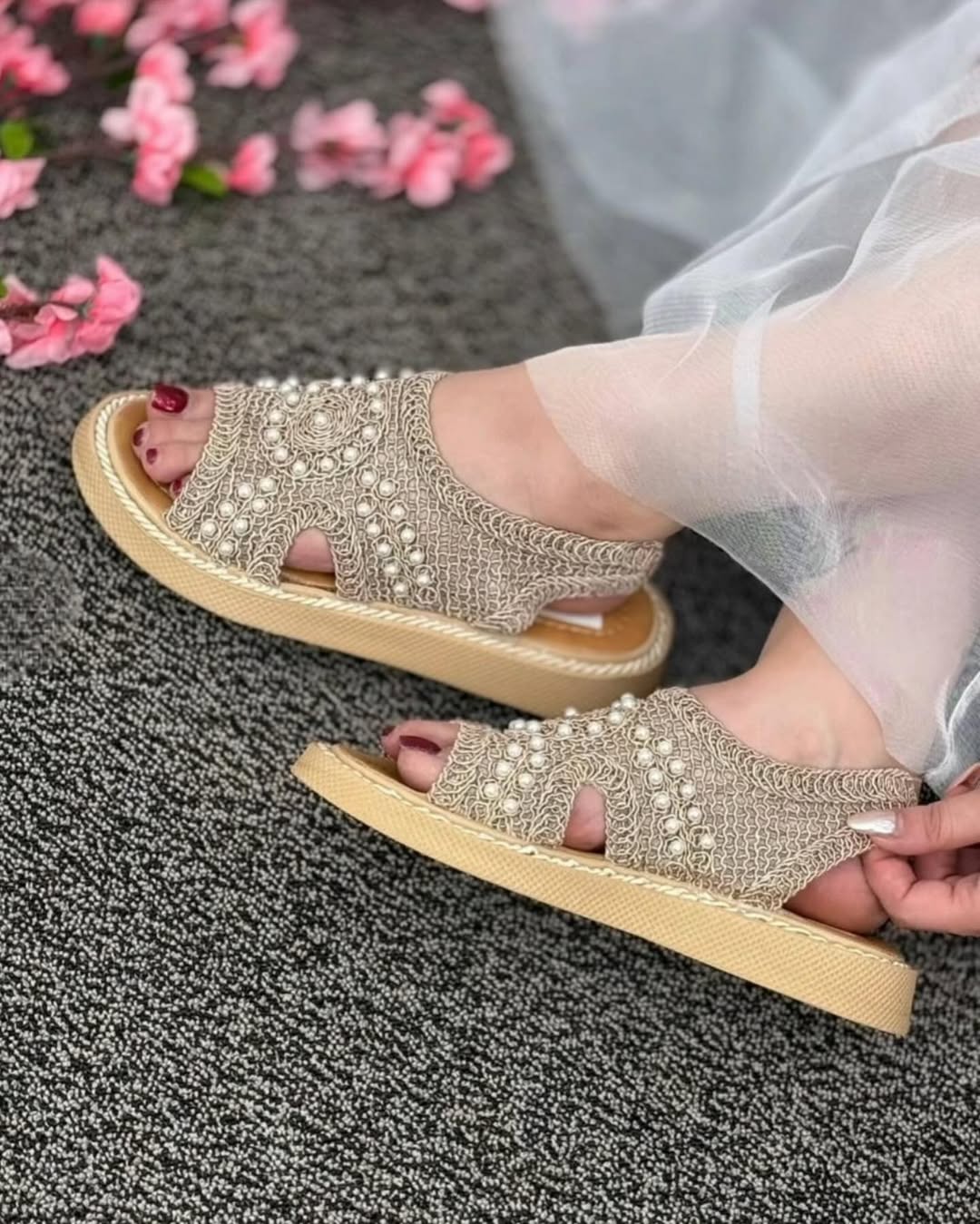 صندل زنانه طرح گیپور مروارید دوز با استفاده روزمره دارای زیره پیو سبک قالب استاندارد نرم،کیفیت بالاموجود است این صندل لژ و پاشنه: ۲سانت داشته و در رنگ های مشکی،کرم،عسلی موجود است