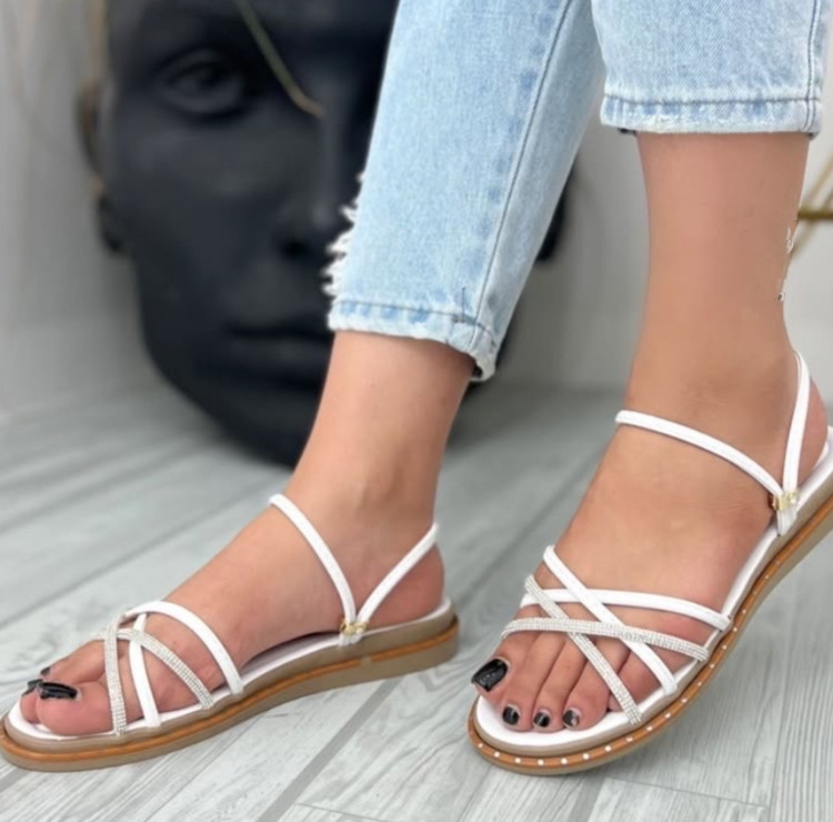 صندل زنانه مجلسی مدل نگار با طراحی رویه بند بندی و نگین کاری شده در رنگ های مشکی و سفید موجود است.این صندل کفی صاف داشته که در مجلس فشاری به پا ایجاد نمیکند .مناسب برای انواع مدل پا می باشد.