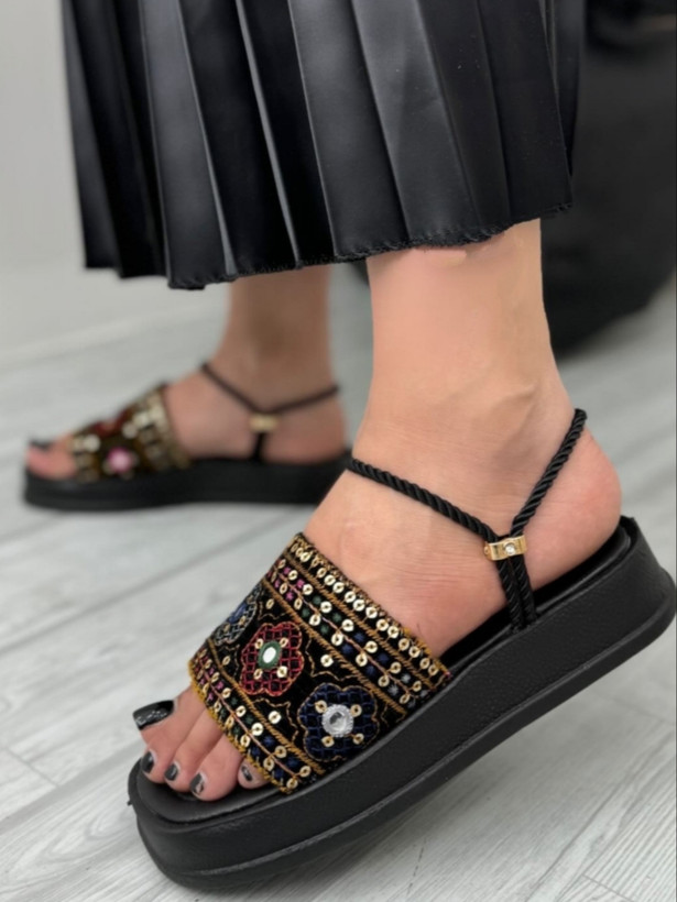 صندل بسیار بسیار شیک مجلسی با رویه طرح دار سنتی در رنگ های زرشکی،مشکی تمام،طلایی،مشکی سفید و کرم برای زیبا پاهای شما موجد است.این صندل با رویه زیبا و لژ 4 سانتی علاوه بر زیبایی فشار را از روی پاهای شما برداشته و برای استفاده های طولانی بسیار مناسب می باشد.