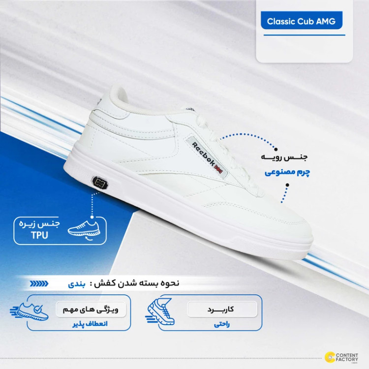 کفش کتونی ری بوک مدل کلاسیک با یک طراحی ویژه و راحت در رنگ سفید بسیار شیک و زیبا برای خانم ها و آقایان موجود است .این کفش با طراحی خاص بسیار مناسب برای پیاده روی و ایجاد یک تیپ خاص و شیک است. لژ 3 سانت این کفش در پیاده روی های طولانی مدت مانع از خستگی پاهای شما میشود.